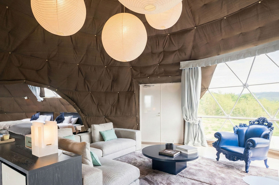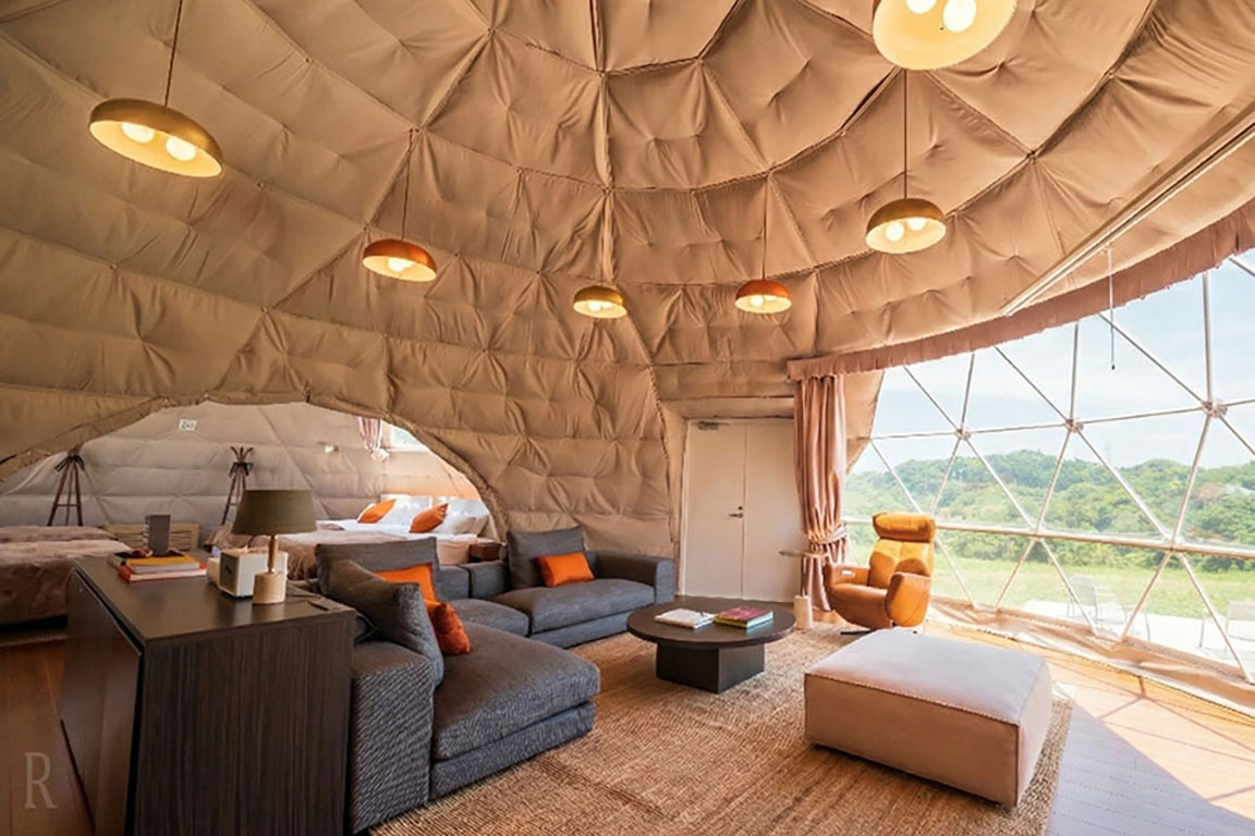都心から東京湾アクアラインで1時間のワールドリゾート。房総の大自然に囲まれたラグジュアリーなグランピング施設。FUTTSU BRISTOL HILL敷地内に建つツインドームテントは、寝室・リビングが分かれジャグジーバスも備わる上質空間。有名シェフの手で昇華された、至高のフルコースディナーに舌鼓を。を完備。内装にこだわったラグジュアリー空間で大自然を五感で感じる滞在を。