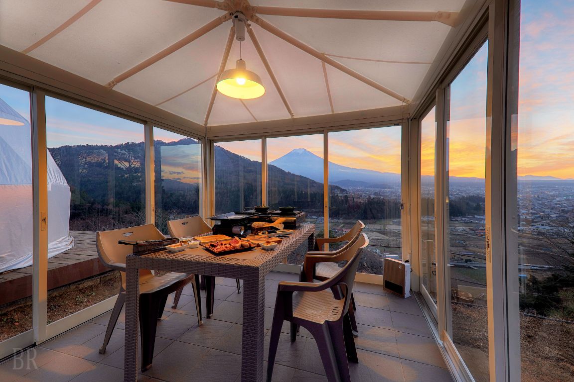 富士山の絶景を望む場所に位置しており、澄んだ空気と美しい夜空を望むロケーション、良質な泉質の客室温泉露天風呂、山梨の自然のめぐみを使用したグランピングBBQ。