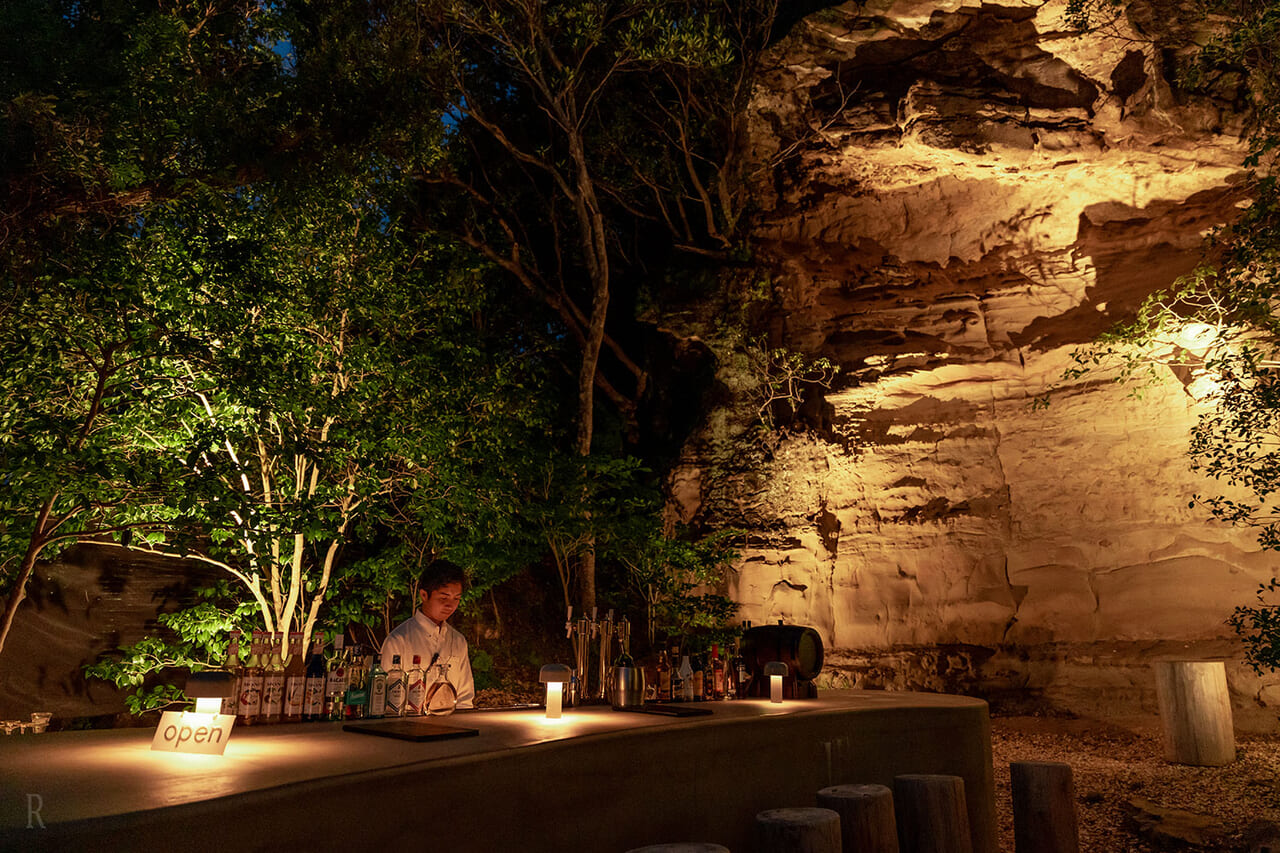 海を見下ろす場所にサウナを備え、自然の中で ととのう。 夜は焚き火を囲い、音楽に酔いしれる。 ライトアップした岩肌の前にはバーカウンター。バーはもちろんFREEでご利用いただけます。