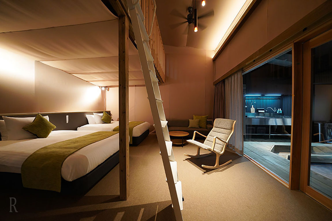 全5棟のスイートヴィラは、すべて独立型の設計で、快適さとプライベート感が調和する静寂の空間。ロフト付き188㎡のゆとりある造りで、大切な人と心からくつろげます。さらに、全棟に源泉掛け流し温泉、バレルサウナ、焚火スペースを完備し、上質なアウトドア体験をお楽しみいただけます。