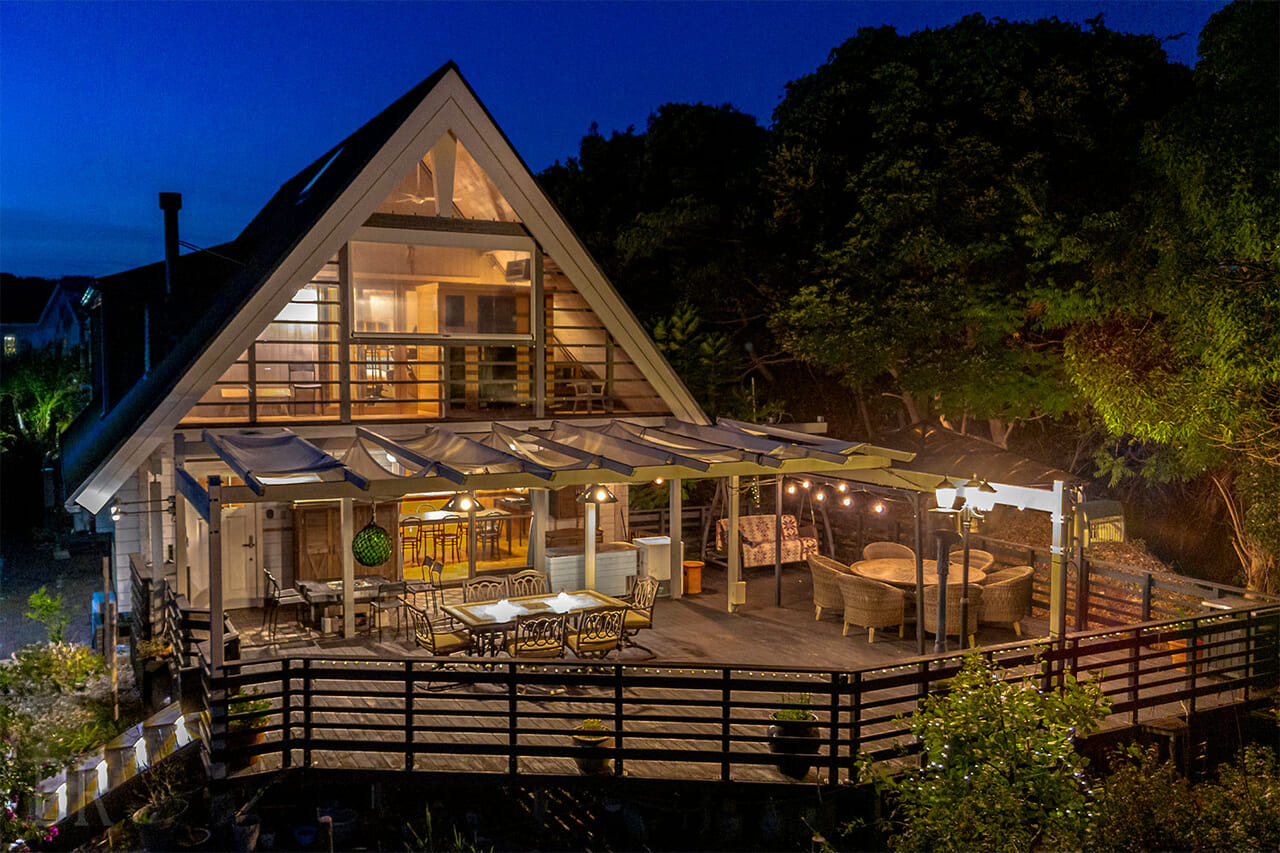 50平米あるウッドデッキは、海を見下ろせる絶景です。人工芝のドッグランに比べて、夏のわんちゃんの足裏にも優しくなっています。