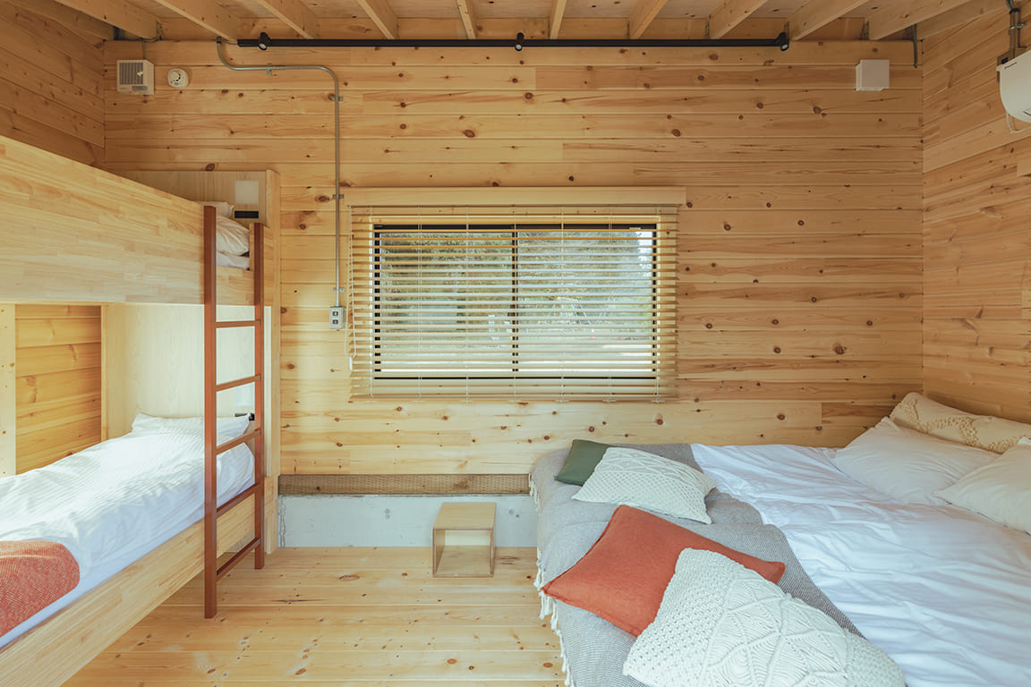 客室には2種のタイプをご用意。 シンプルなインテリアと優しい木の香りがするリラックスできる空間となっています。 お子様含め最大定員3名と最大定員6名まで宿泊可能なお部屋となっております。 2棟3棟を借りてグループでの滞在やカップル、ファミリーの滞在もお楽しみください。