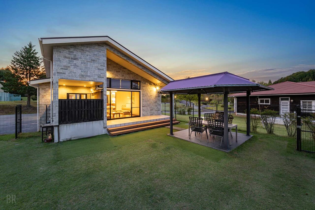 各お部屋に屋根付きのBBQスペース、室内にキッチン付の食事スペースをご用意しております。