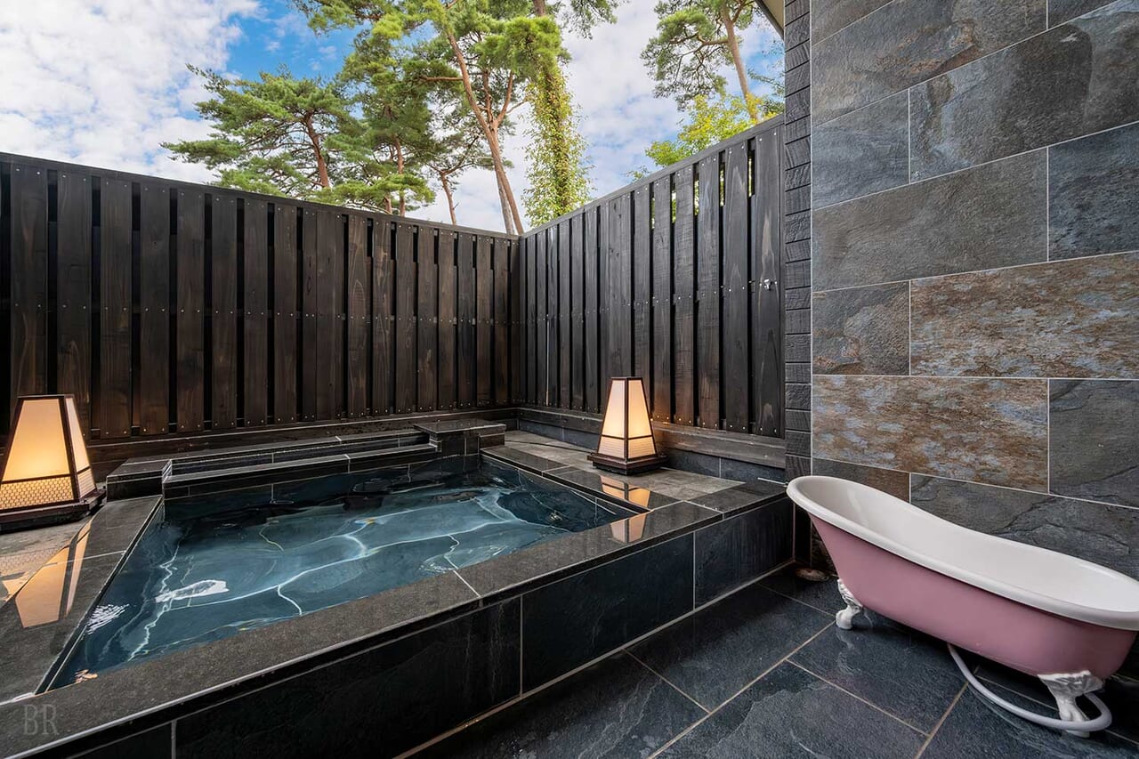 各棟には星空を望む客室露天風呂をご用意しております。 保湿効果の高い天然鉱石を使用した人工温泉を各棟に配しており、湯冷めしにくいのが特徴です。