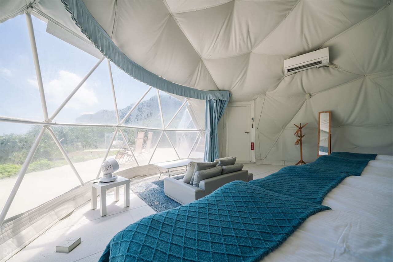 リビングスペースとBBQスペースで分かれており、二つのドームは扉で仕切られているので煙の心配はありません。両ドームとも冷暖房を完備しているため、季節や天気に関わらず快適にグランピングステイをお楽しみいただけます。