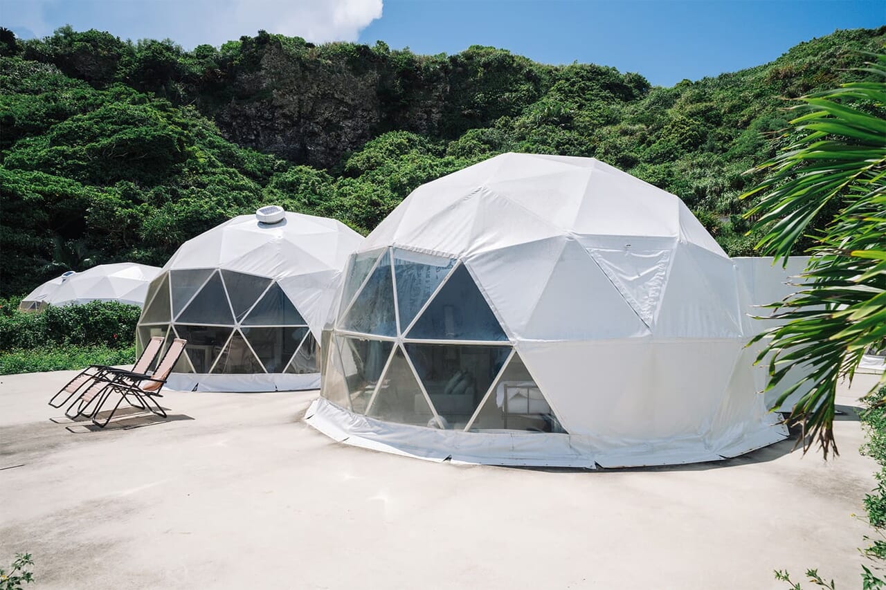 沖縄県初のツインドーム(連結型ドームテント)を採用しています。 リビングスペースとBBQスペースが二つのドームに分かれており、扉で仕切られているため煙の心配なく快適に過ごせます。 直径6~8mの広々としたリビングは、最大6名まで宿泊可能で、大人数での滞在にも最適です。