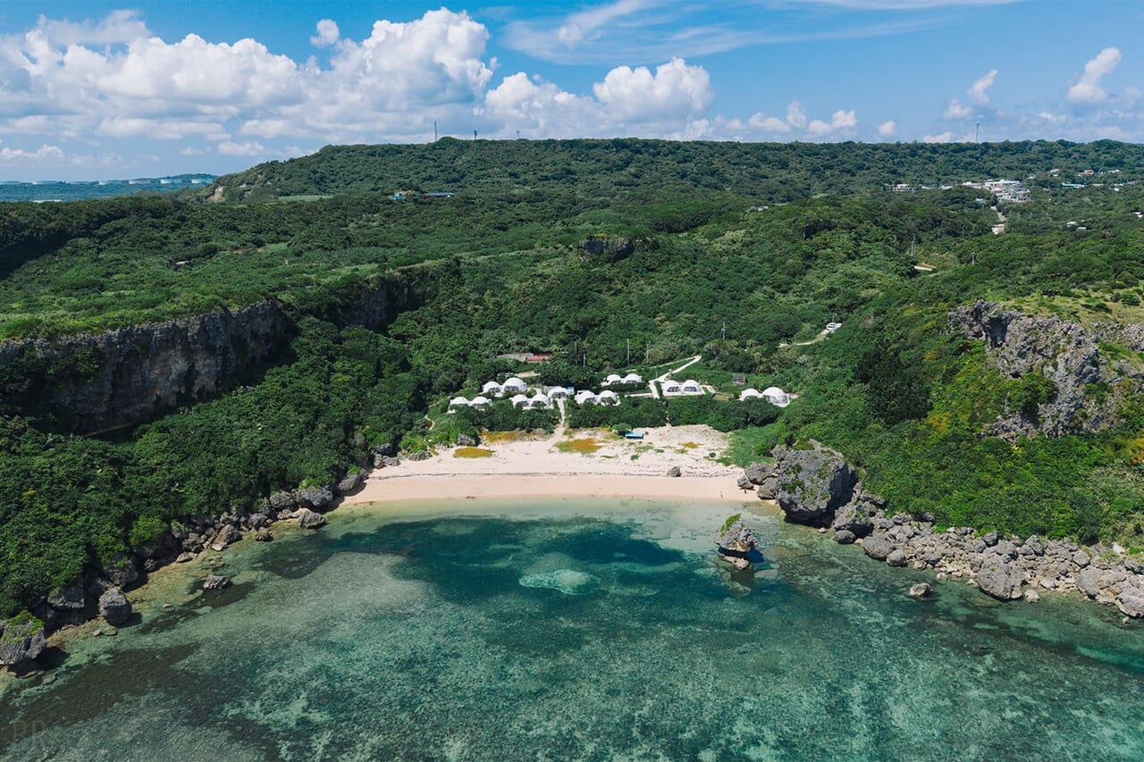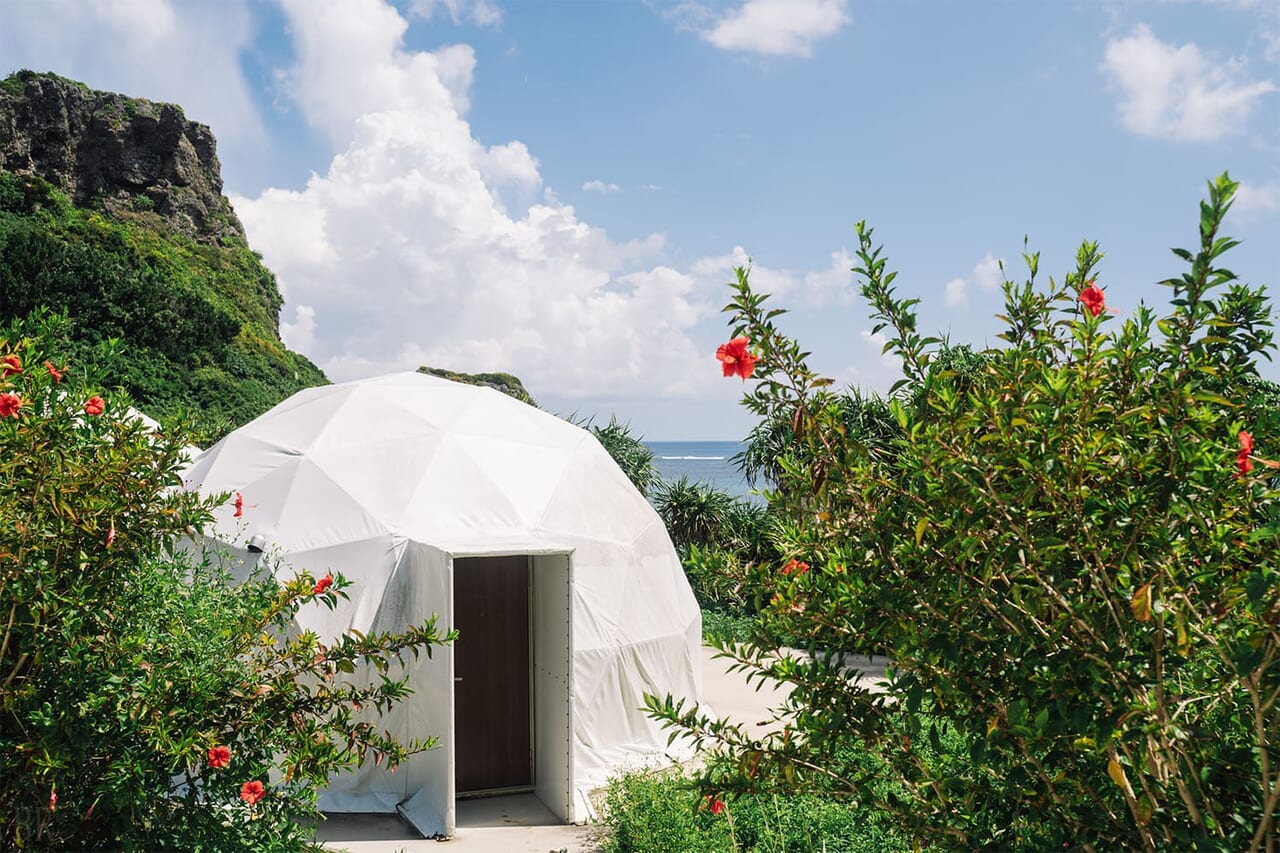 車でアクセス可能な離島、沖縄県中部・宮城島に、極上のビーチサイドグランピング施設は位置します。 施設名にも冠された**「アクナ浜」は、ドームの目の前に広がる天然ビーチ。ウミガメの産卵地としても知られ、沖縄有数の高い透明度**を誇ります。 グランピングドームから徒歩0分という最高のロケーションで、透き通る海での遊泳や、波音を聞きながらのラグジュアリーな大自然体験をご満喫ください。