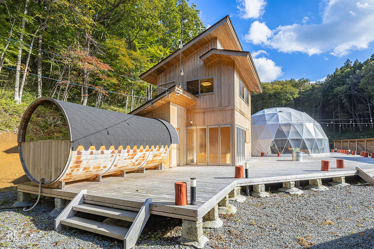 美しい自然に囲まれた福島県須川市に、東北エリア初・直径10mの国内最大級ドームテントと大型バレルサウナ、コテージを完全貸切で利用できるプライベートグランピング「響きのサウナグランピング」が誕生。 グループ利用に最適、【最大20名まで】ご宿泊可能です。広大な敷地にはドッグランも備え、愛犬連れでもご利用頂けます。