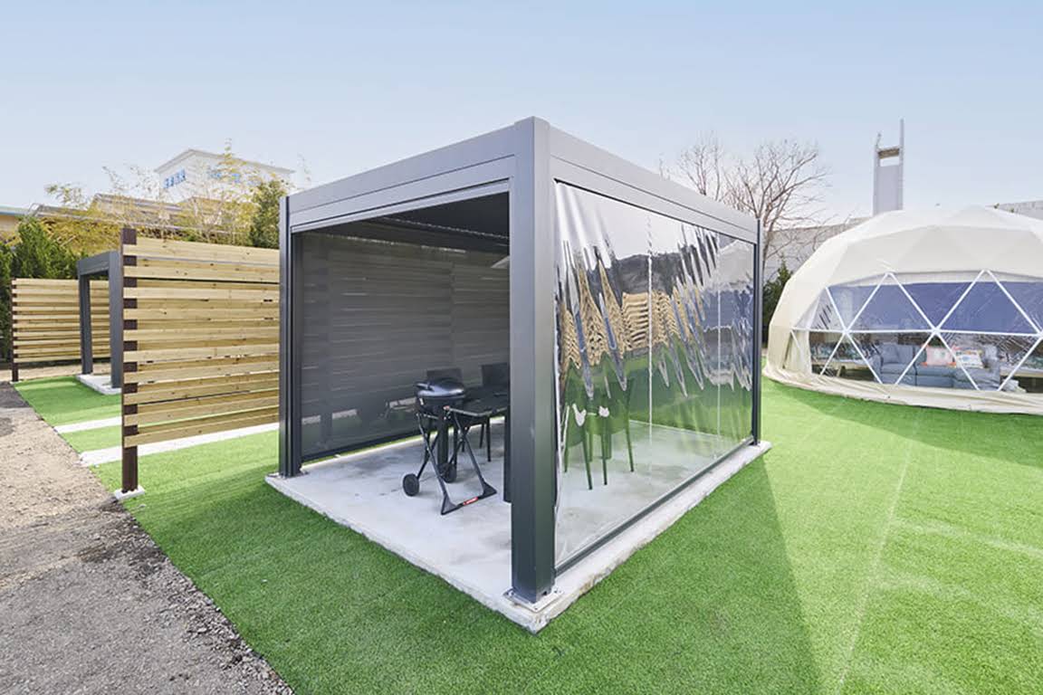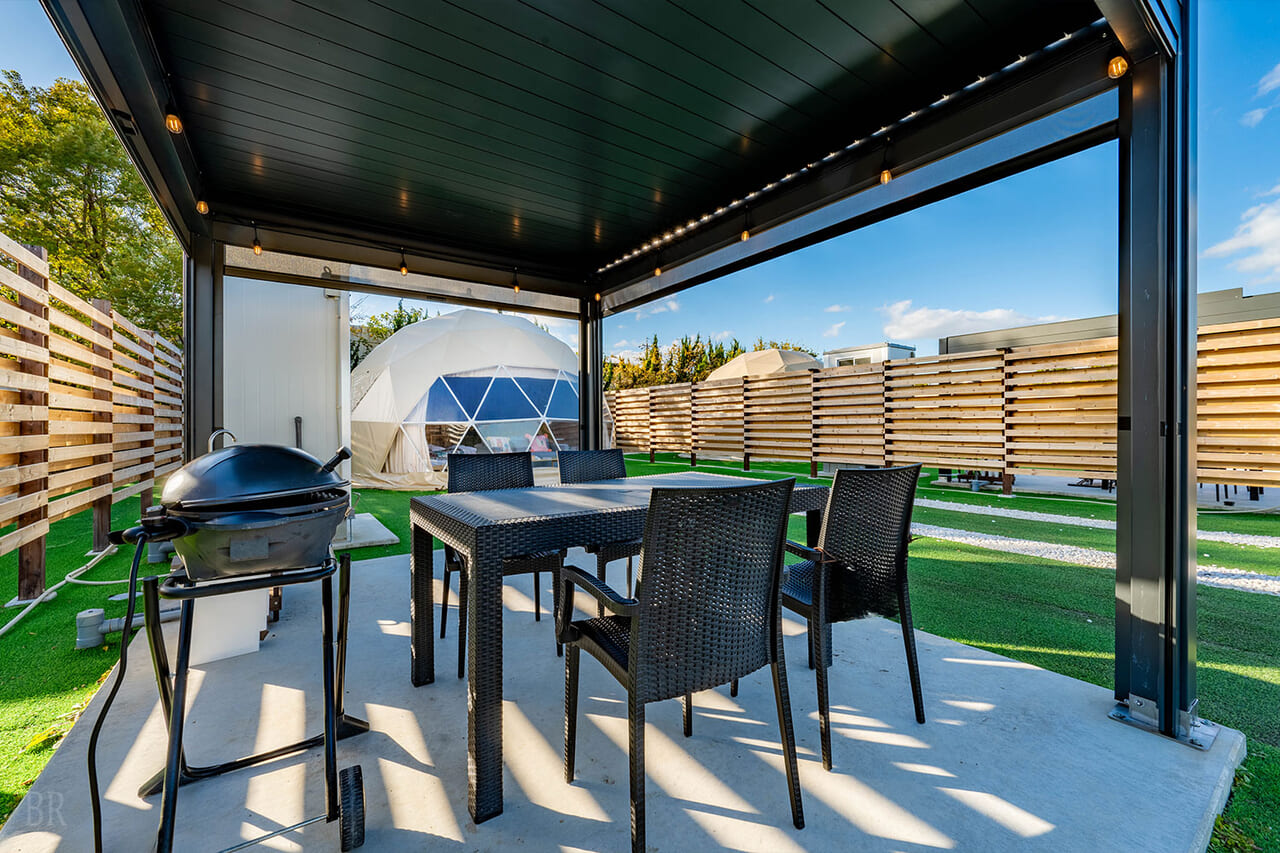 ドームテントすぐ横にあるBBQスペース。定員4名分のテーブル、椅子がございます。 お子様用の椅子はございません。予めご承知おきくださいませ。