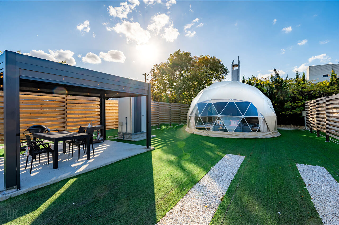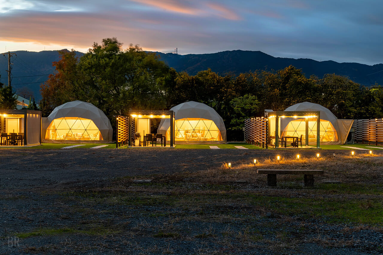 黄金色に輝く天然温泉グランピング- 海津温泉 -は、敷地内にドームテントが3棟。プライベートな空間を味わいつつも、アウトドア気分を味わえる特別なグランピング施設です。 最大4名が宿泊できるドームテントは、エアコン完備で暑い夏や寒い冬でもオールシーズン快適にお過ごしいただけます。