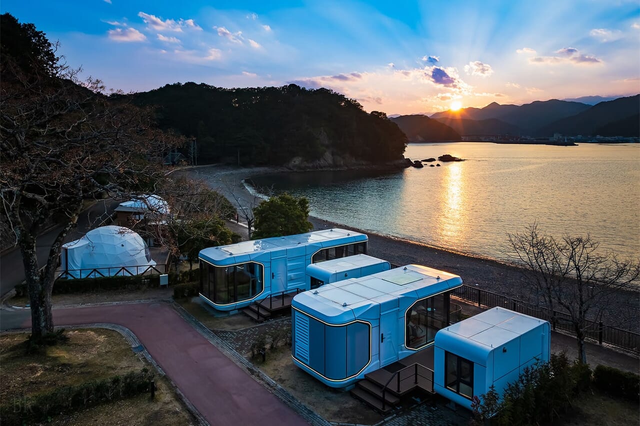 世界遺産 熊野古道のまち三重県紀北町の熊野灘臨海公園内に位置するシーサイドグランピング孫太郎。海と山に囲まれた大自然を満喫するオーシャンビューグランピングとなっております。個別のトイレ・シャワールーム完備で、初心者の女性やお子様でも安心のグランピング体験を。
