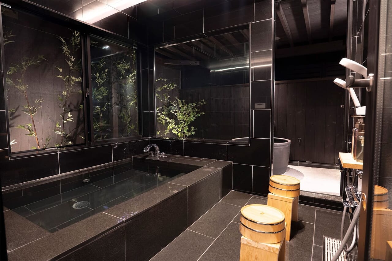 信楽焼の露天風呂や石張りの半露天など趣の異なる3つのお風呂を備え、シーンに合わせた優雅なバスタイムを演出します。洗面・トイレ各2箇所のほか、ガス乾燥機やダイソンのドライヤーも完備し、大人数や連泊でも快適な滞在を叶えます。