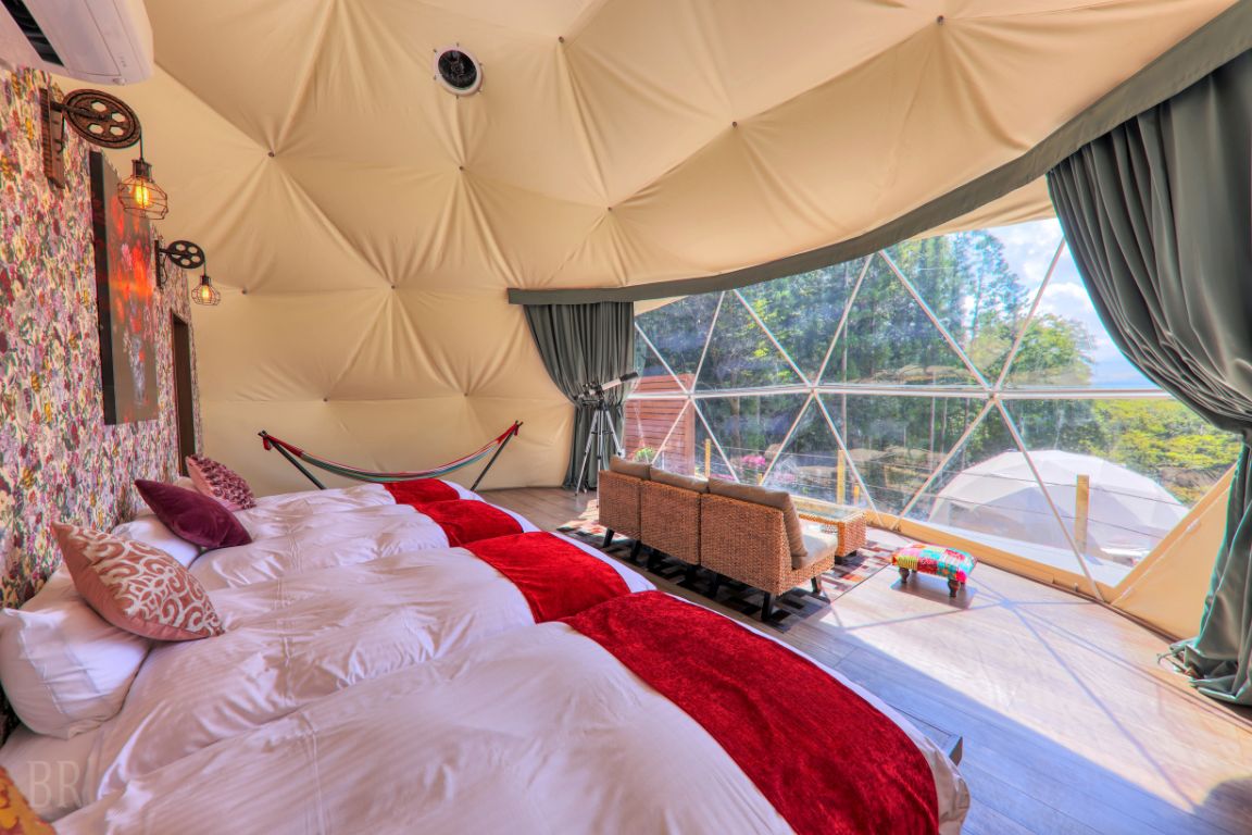 2500 ㎡テニスコート 10 個分の針葉樹の森の中に佇むわずか3棟のグランピング施設は、全室から富士山を望める絶景設計。大自然の中、家族や仲間との仲を深められるプライベートグランピングをご堪能下さい。