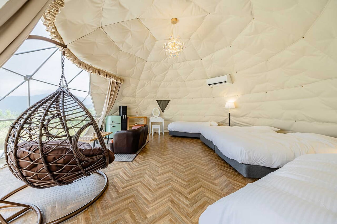 上質な眠りと、爽やかな朝を迎えるために。 すべてのお客様に快適な睡眠時間をお届けできるよう、シモンズ製ベッドを導入しています。 個性豊かな4タイプのドームテントは、それぞれ異なるデザインと雰囲気が魅力。愛犬と一緒に宿泊できるお部屋もご用意しています。 大切なペットとともに、心ほどける穏やかな時間をお楽しみください。