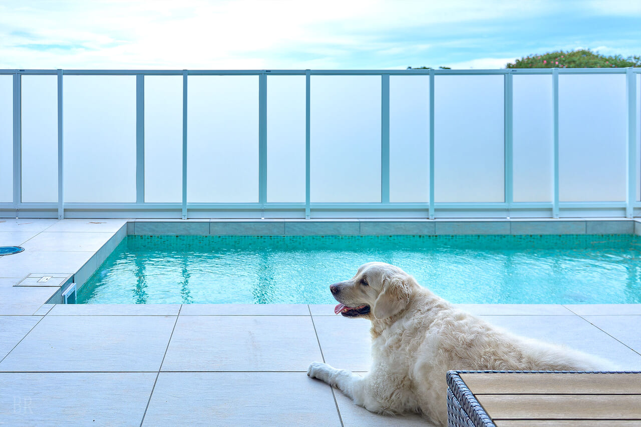 • ワンちゃんと一緒に楽しめるプライベートプールを完備。プールはわんちゃんも飼い主も安心の水深50cmの浅め設計