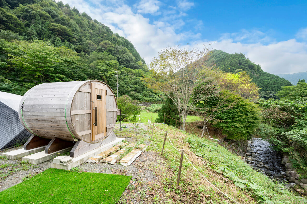 1日1組限定貸切・広がる空と心地よい風に包まれる非日常空間に、自然と調和するドームテント、アロマテラピーを取り入れたバレル式サウナ、プライベートガーデンを備えたグランピングリゾート。