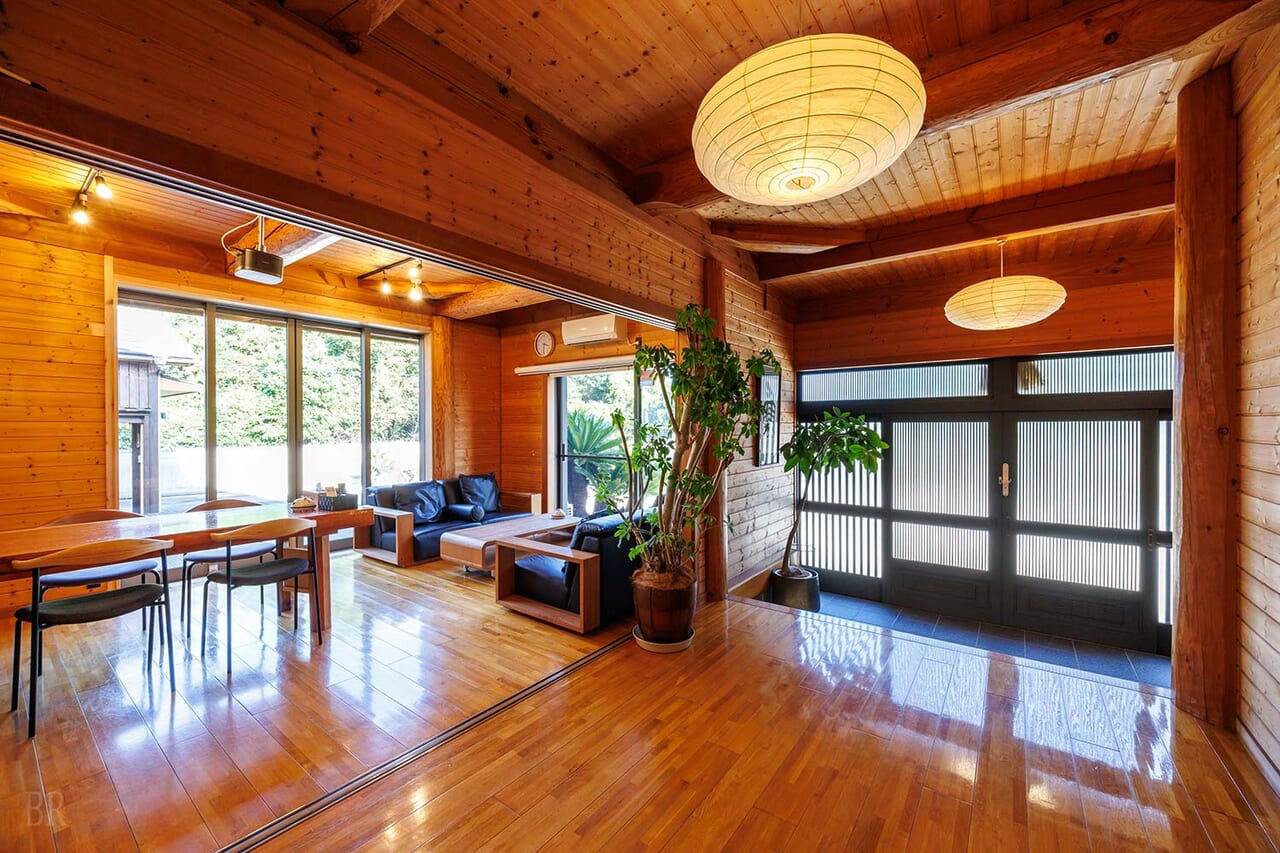 広島県庄原エリア、広大な室内は現代的なグランピング体験が可能な最新施設としてフルリノベーションされた『こざこ森』 周囲の森と室内を一体化させる全面ガラスに覆われた土間リビングをはじめ、ペット同伴可能な一棟貸しの古民家で自然を満喫できる遊び心いっぱいの新しい宿泊施設です。