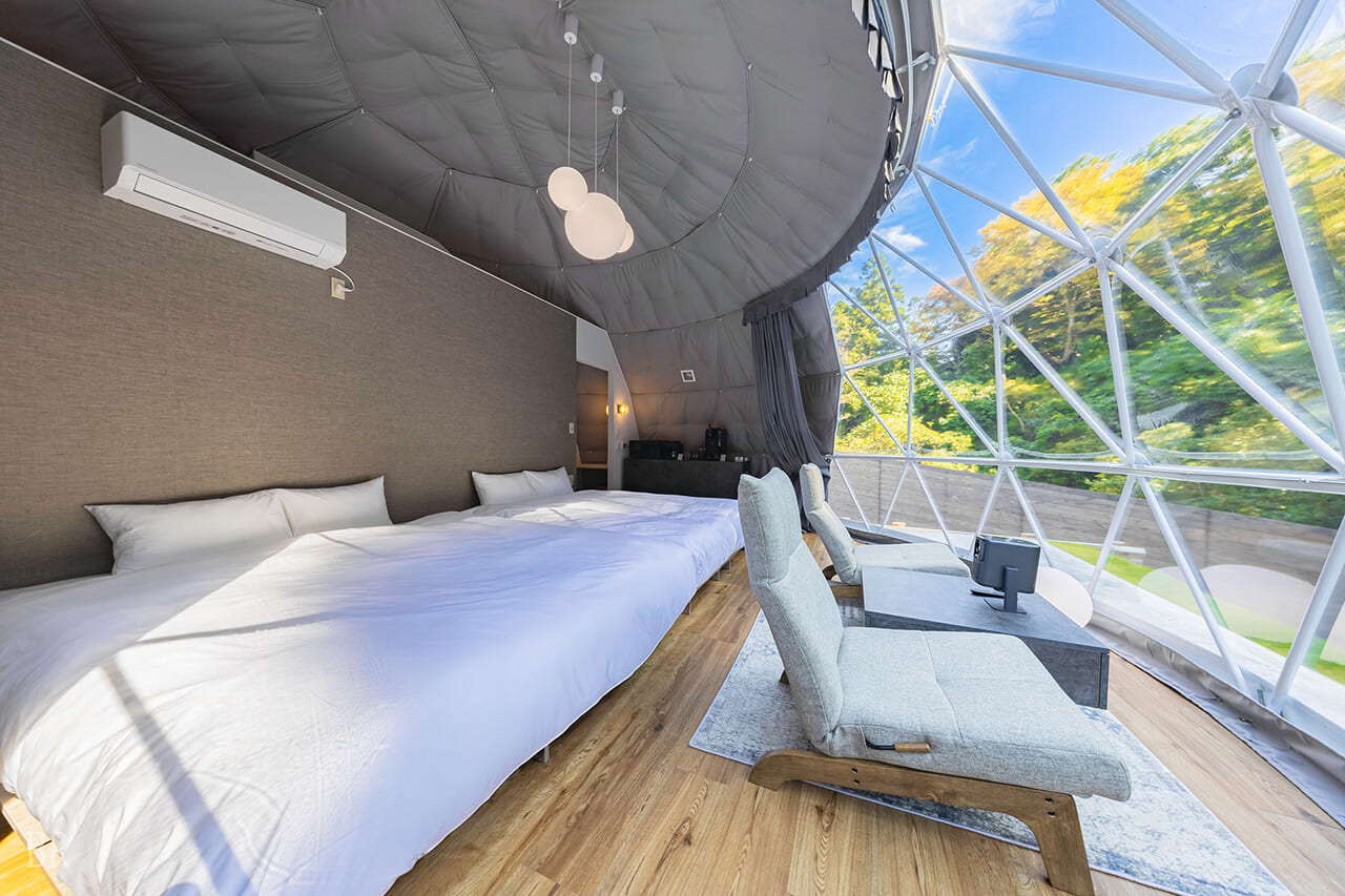 エリア最大級の客室面積を誇るラグジュアリーなプライベートヴィラや、約1,000㎡のプライベートドッグランが付いた客室、直径8mの大型ドームテントなど、解放感溢れるお部屋をご用意しています。