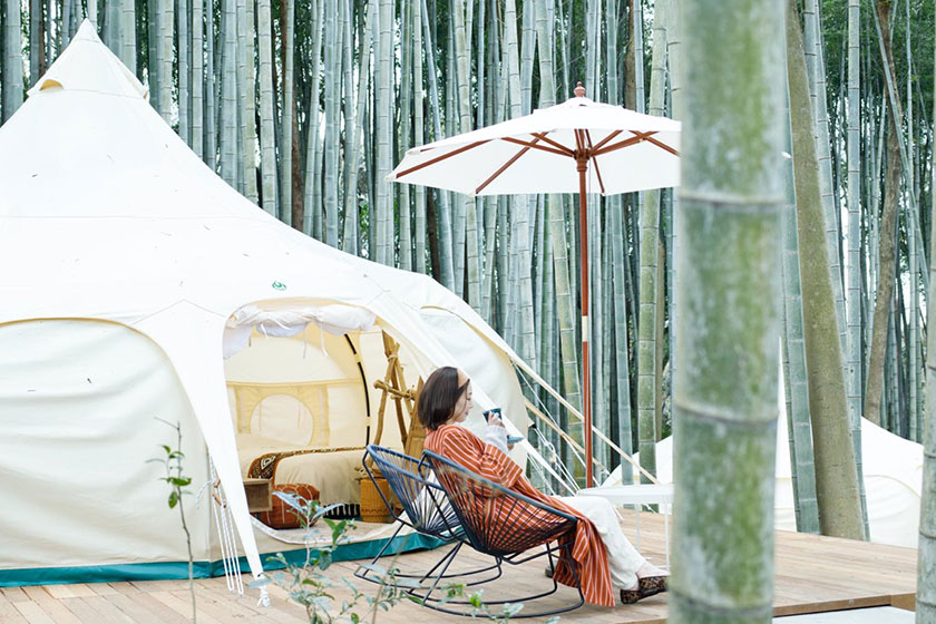 千葉県市原市、サユリワールド(ふれあい動物園)横に、2020年3月に誕生した「THE BAMBOO FOREST」。近隣には「市原ぞうの国」もあり、動物園とグランピングの楽しさを一緒に味わえるグランピング施設です。竹林に囲まれた敷地内には、ドームテントとロータスベルテント、そしてツリーハウス型ロッジという3種類の宿泊施設があります。