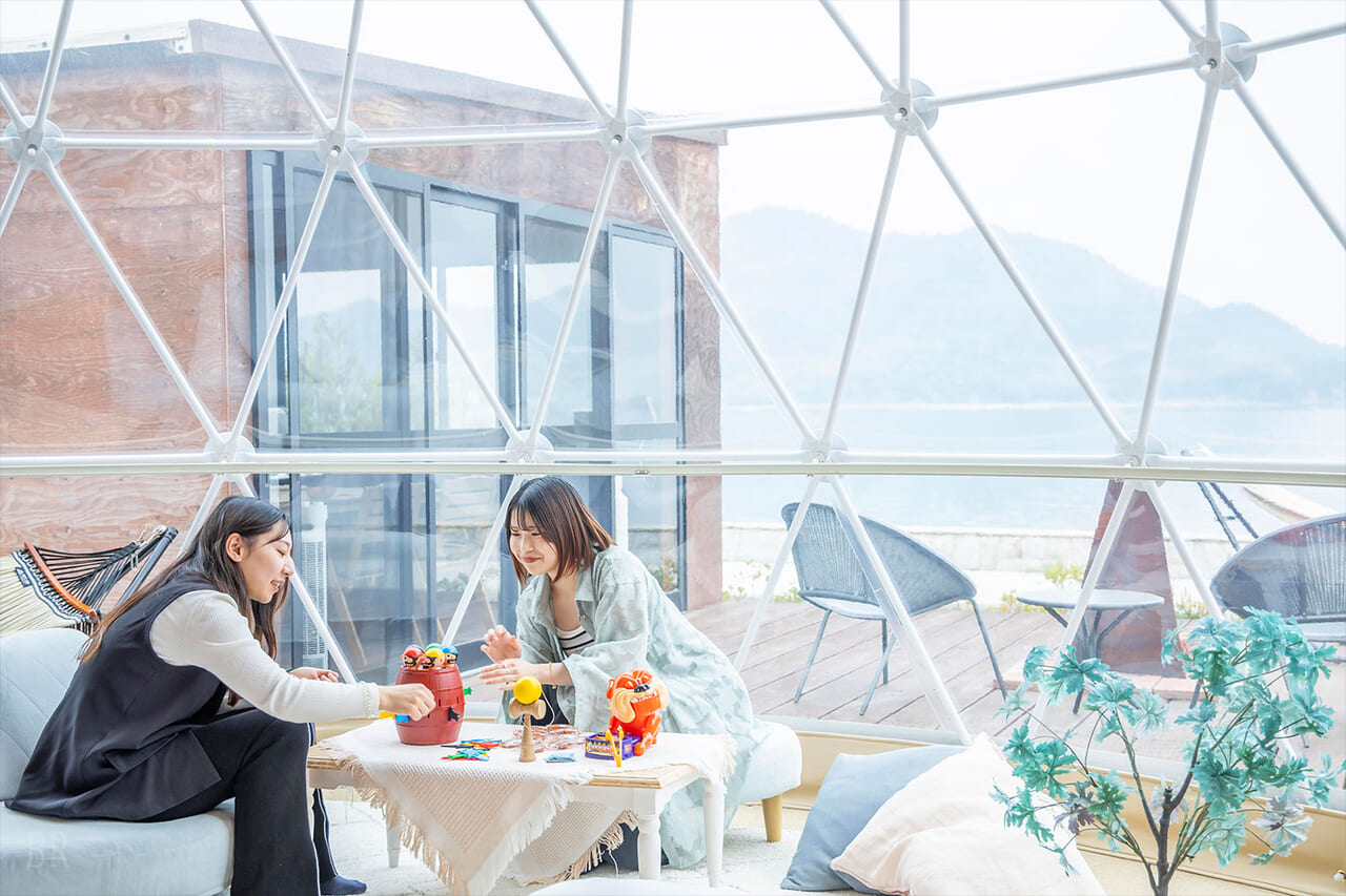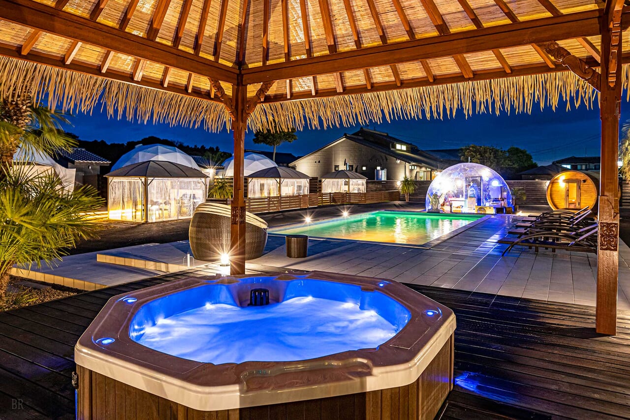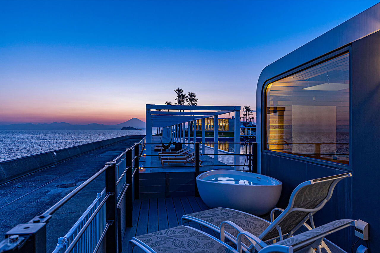 宿泊棟は全面ガラス張りで、広がるオーシャンビューを独り占め。テラスには大人2名がくつろげるバーデプールも完備されており、水着で優雅にリゾート気分を満喫できます。このおしゃれな空間は、友達との撮影会や、特別な記念日のロマンチックな演出にぴったりです。