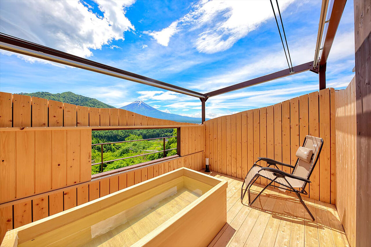 さらに、ここでは景色を楽しみながら入れる天然鉱泉の貸切露天風呂が無料で利用可能! 富士山を眺めながら温泉で疲れを癒せるなんて、贅沢すぎますよね。食事は山梨のブランド豚「甲州富士桜ポーク」をメインとした本格BBQを、屋根付きの専用食事スペースで楽しめます。