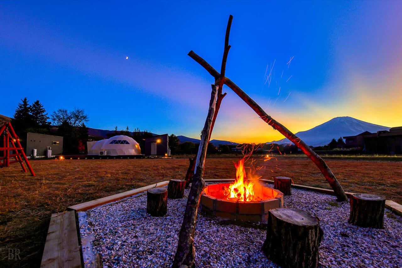 全7棟のドームテントからは、壮大な富士山を望むことができ、ロケーションも最高。テントにはエアコンや個別のトイレ・シャワールームが完備されているため、キャンプ初心者でも安心です。夜はBBQと焚き火を楽しんだ後、みんなで本格サウナでリフレッシュできます。