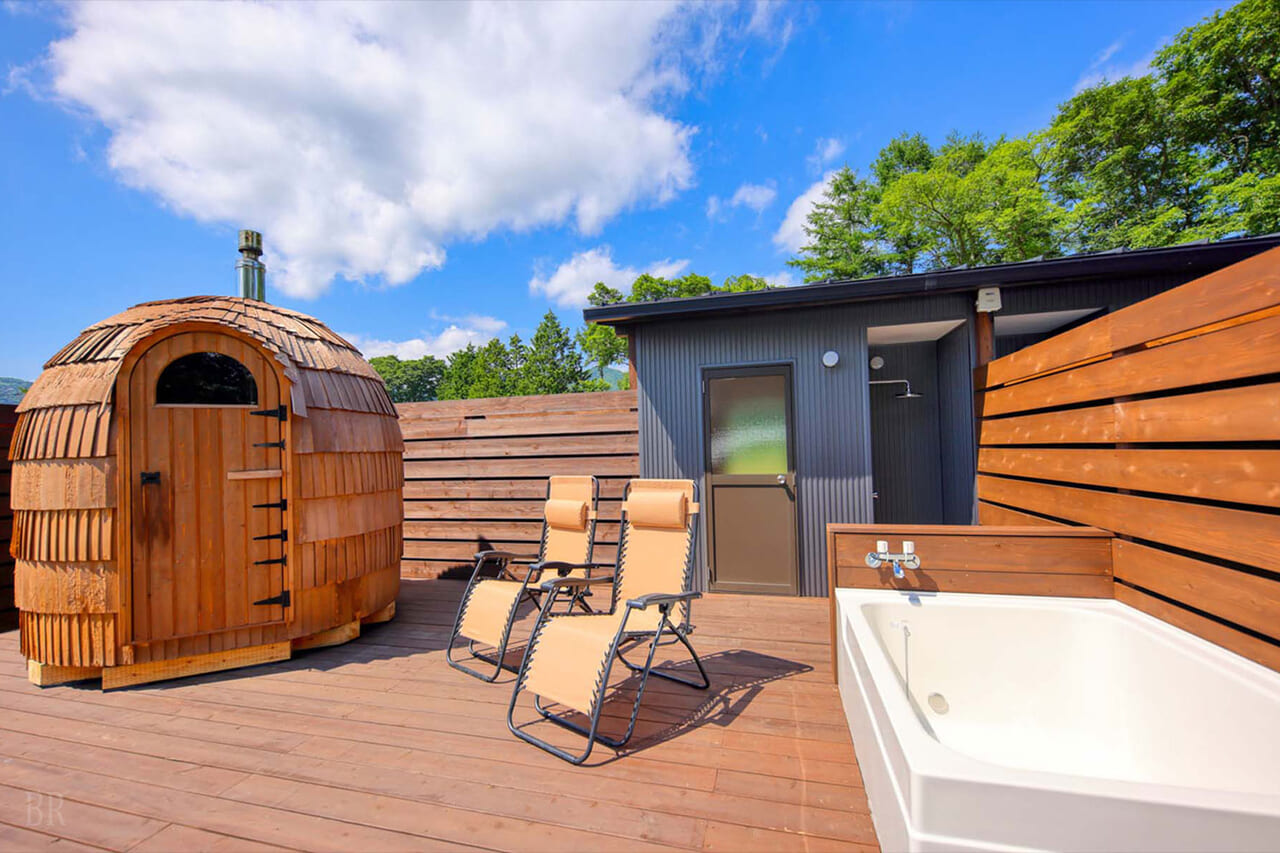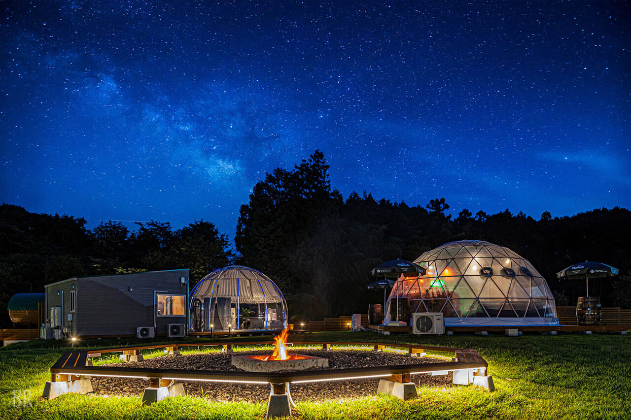 栃木県の人気観光地、那須高原に位置する「グランピング B&V 那須高原」は、「高規格なのに2万円台から泊まれる!」という圧倒的なコスパが魅力です。ここは、なんと全棟にバレルサウナと温泉付き露天風呂を完備。サウナ好きの学生グループにとって、他の宿泊客に気を遣うことなく、好きな時間に最高の「ととのう」体験が貸し切りでできるのは、最大の推しポイントです! 夜には、那須の静かな星空の下で外気浴を楽しんで、心身ともにリフレッシュできます。