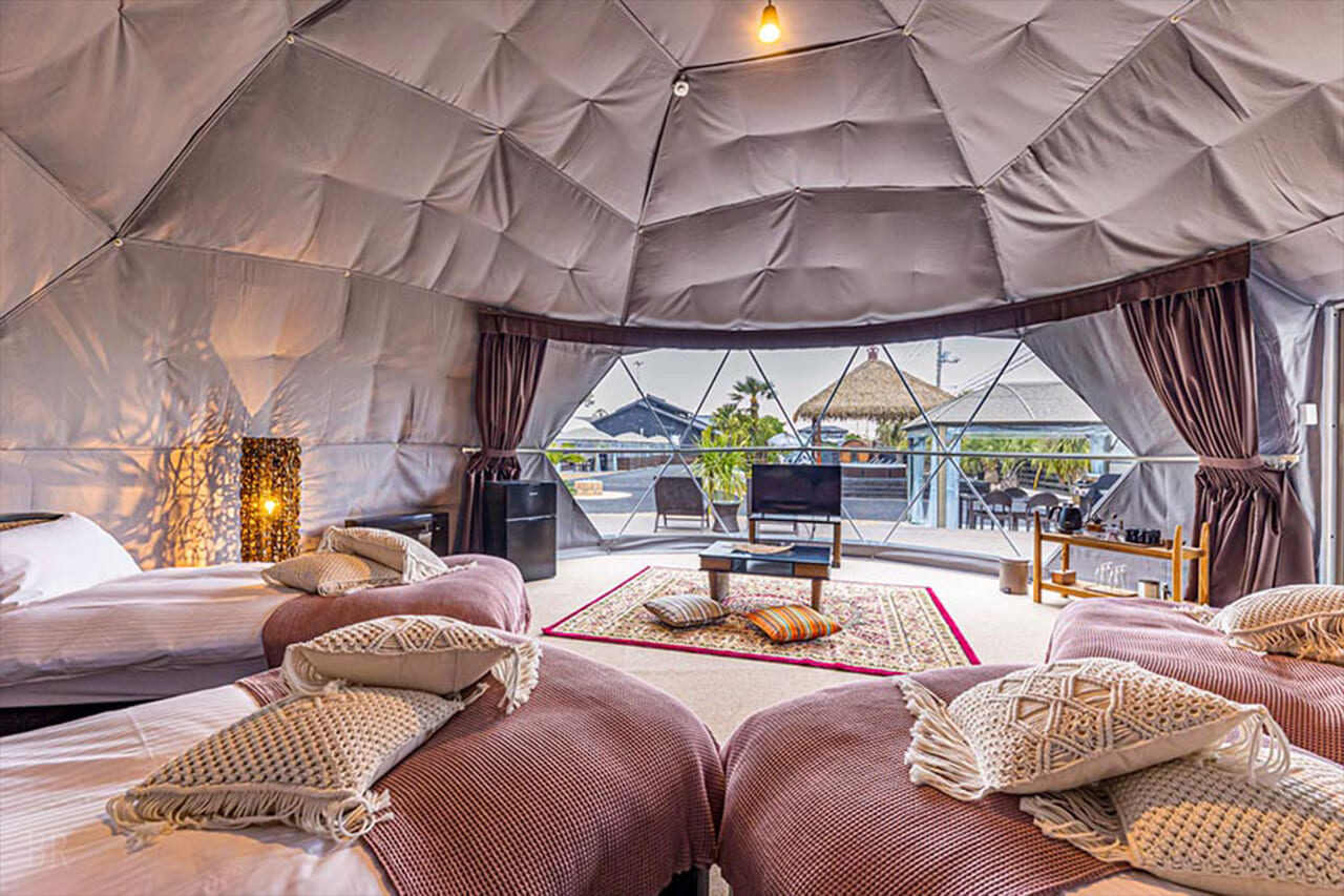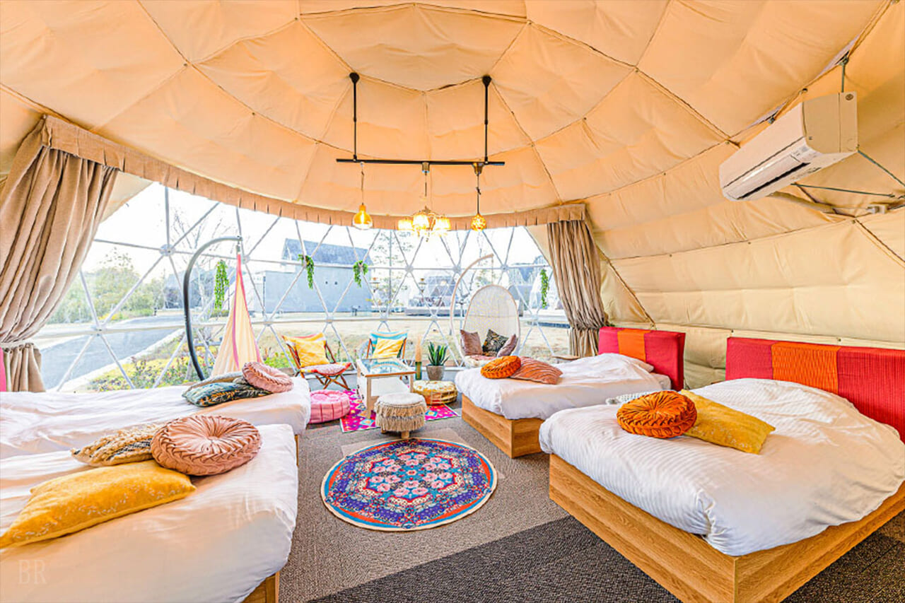 テントは広々としたドームテントや、友達8人まで一緒に泊まれるツインドームなど、部屋タイプが豊富なのも学生グループに最適です。みんなで一部屋に集まれるため、料金を割り勘すれば、さらにリーズナブルに贅沢な滞在が叶います。